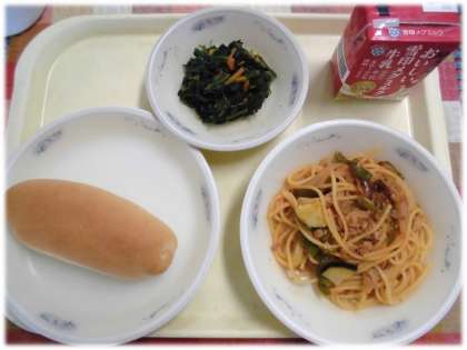 今日の給食は小型コッペパン、牛乳、イタリアンスパゲティ、ほうれん草のソテーです。