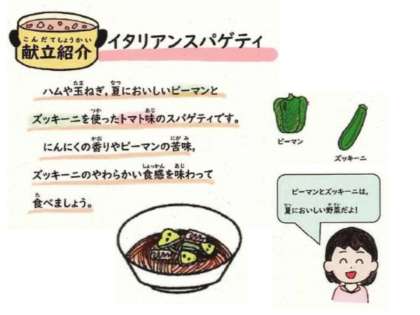 「イタリアンスパゲティ」は夏においしいズッキーニ、ピーマンを使っています。とても好評で教室をのぞいてみると、「苦手なピーマンも食べられたよ」とうれしい声が聞こえていました。