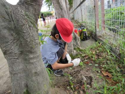 今日は、全校草引きがありました。にじいろ学級は、運動場の草引きをしました。