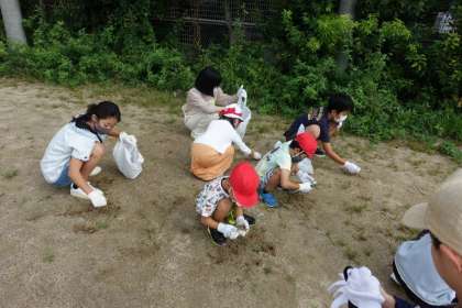 たてわりペアの6年生と一緒に、運動場の草引きと石拾いをしました。6年生にやり方を教えてもらいながら、集中して取り組んでいました。