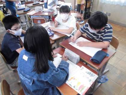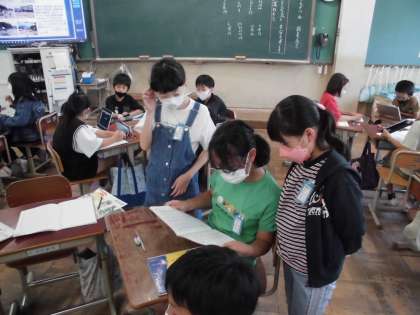 「ごんぎつね」の作者である新見南吉さんの本を読み、登場人物の人柄や話の結末について自分で考えたことを、同じテーマのグループで話し合いました。交流することで新しい考えが生まれたり、自分の考えの見方が少し変わったりします。みんなよく考えて話し、書くことができました。