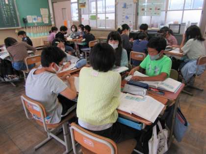 国語科では、「固有種が教えてくれること」の学習を進めています。この日は、説明文がどこで初め・中・終わりに分かれているか確認し、中のそれぞれの段落に見出しを付けました。グループで「ここは、固有種が生きる環境について書いているね」「この段落は、『固有種の保護』という見出しがいいと思うんだけれどどうかな。」など、意見を出し合いながら見出しを考えていました。