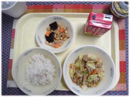 今日の給食は麦ごはん、牛乳、豚肉とキャベツのみそいため、五目煮豆です。「五目煮豆」は、スチームコンベクションオーブンを使って蒸して作りました。ふっくらした、甘い豆をおいしくいただきました。