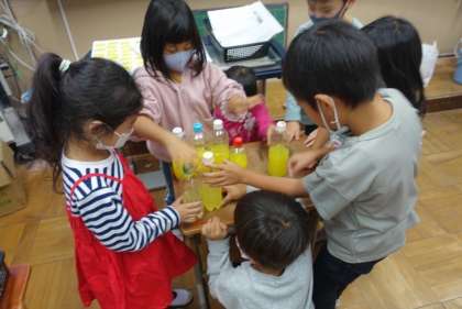 色水が完成したあと、まずは同じ色の人たちで集まりました。絵の具の量や水の量などがちがうので、一人一人違う色ができていました。
