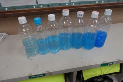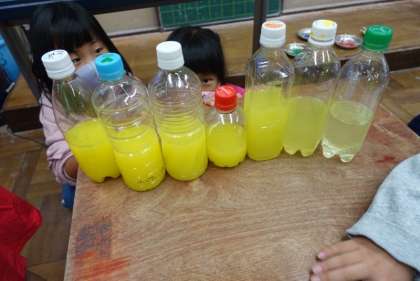 相談しながら、色の濃い順にペットボトルをならべかえることができました。