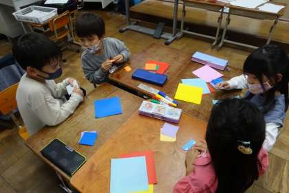 クラスのみんなを楽しませることを考えながら、係活動をしています。折り紙でかざりをつくったり、クイズを考えたりして、意欲的に取り組んでいます。