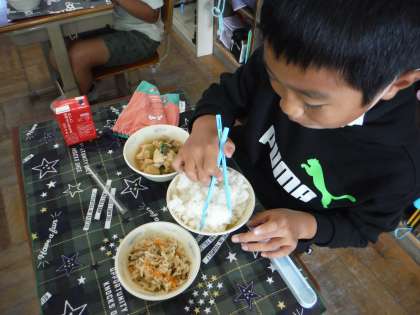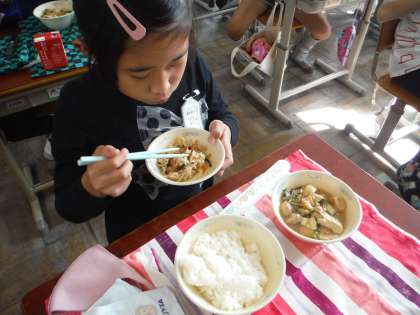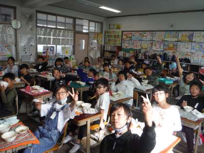 嵯峨野小学校の給食はとてもおいしいです。今日も「おいしい!」と給食をモリモリ食べる3年生です!!