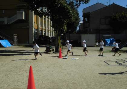 体育では、「ゆっくりかけあし」の学習をしています。