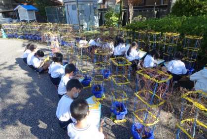 1学期から大切に育ててきたあさがおの、最後の観察をしました。葉っぱの色やさわった感じのちがいなどに気付いていました。