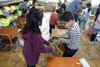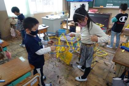 あさがおのつるを使って、リースを作りました。まずは、支柱にぐるぐると絡みついているつるを、二人で協力しながら取っていきます。