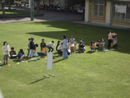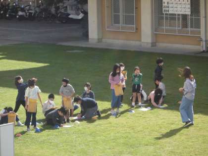 月の観察の仕方を学びました。自分のこぶしの高さを基準に、月の高さはこぶし何個分かで調べることができます。夜に見えるイメージの強い月ですが、昼間もぜひどこに見えているのか、気にかけてみてほしいと思います。