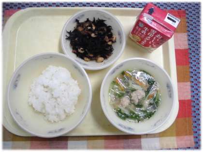 今日の給食は、ごはん、牛乳、水菜とつみれのはりはり鍋、ひじき豆です。今日は旬の食材「水菜」を使用しています。