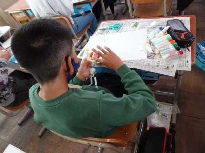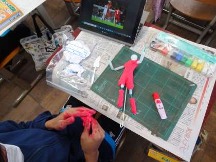 図画工作科の授業で、未来の自分を想像したり、自分が好きなことをしたりしている姿を、ねんどで作っています。針金を折り曲げて、絵の具を練り込んだねんどをつけていきます。手足の角度、体の反り具合など、それぞれが工夫を凝らして躍動感のある作品になっています。今にも動き出しそうです。