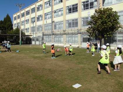 体育の学習で、「パスゲーム」をしています。グループごとにパスをたくさん出して、ゴールに向けてつなぐことを意識しながら学習しています。