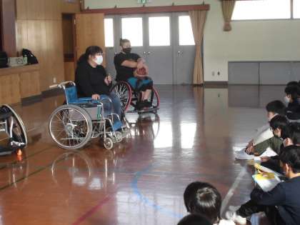 地域に住む阪根さんと、車いすバスケットに取り組まれている八橋さんに来ていただき、車いすで生活することについてのお話を聞いたり、車いすバスケット体験をさせてもらったりしました。とても明るく、楽しくいろんなお話をしていただき、みんなとても熱心に話を聞いていました。