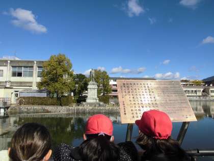 嵐電と地下鉄に乗って、琵琶湖疏水見学に行きました。市役所前駅で下車し、高瀬川を北上して、琵琶湖疏水に沿って東に歩いていきました。途中で夷川発電所や北垣国道像を見つけました。みんな元気に歩いていきました。