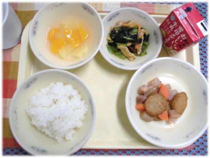 今日の給食は、ごはん(京北米)、牛乳、平天とこんにゃくの煮つけ、小松菜の煮びたし、フルーツ寒天です。今日は豊かな自然のなかでおいしく育った京北のお米を味わいました。