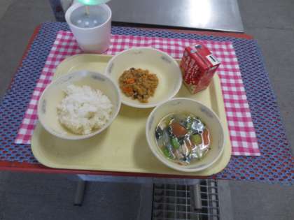 今日の給食は、ごはん、牛乳、ツナそぼろ丼(具)、トマトだご汁です。