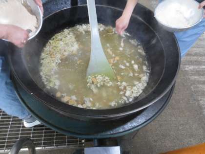 「トマトだご汁」の「だご汁」は九州地方の郷土料理の一つで、「だご」とはだんごのことです・給食では、小麦粉と片栗粉に水とホールトマトを加えて生地を作り、一つ一つだんごを作りました。汁には生のトマトを入れ、さっぱりとしたうま味が味わえました。