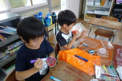 まずは、透明な容器に色をつけます。どんな色にしようか考えながら、集中して取組んでいました。