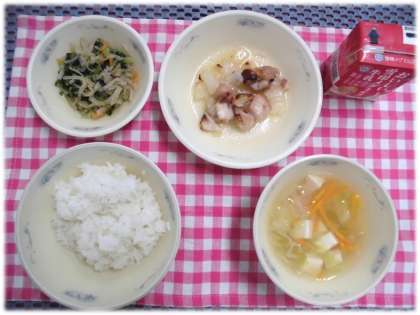 今日の給食はごはん、牛乳、鶏肉のてり焼き、切干大根のごま煮、キャベツのすまし汁です。