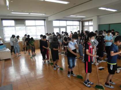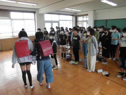 今日は、学年全体で集まり「1年生へ迎える会」で発表する学年の取組の練習をしました。