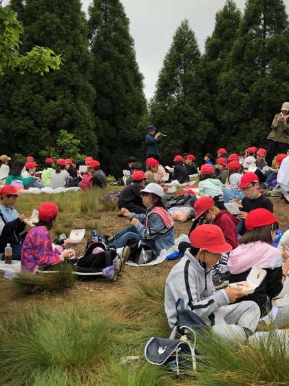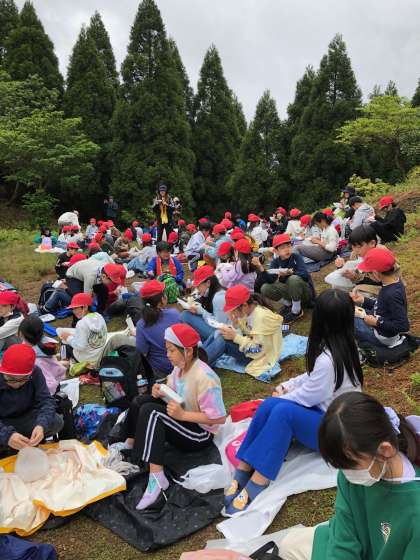 頂上から少し降りて,開けた場所でお昼のお弁当を食べました。食べ始めてしばらくするとまたまた雨が降ってきました。傘をさしたりしながら,文句も言わずに食べている様子は,とてもたくましく,頼もしいものでした。