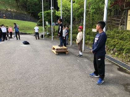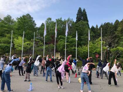 3日目の朝の集いです。集合も司会も慣れてきたようで、司会進行も上手です。体ほぐしのためにきょうもラジオ体操をしました。子どもたちは、昨夜はぐっすりと眠れたようで、登山の疲れも見せずに元気に体を動かしていました。