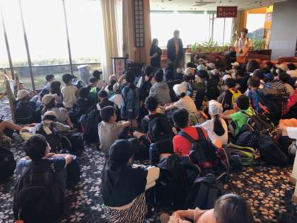 ゆっくりとくつろぐことができたホテルを出発しました。退館式では、綺麗なお風呂で疲れがとれたこと等々、お世話になった感謝の気持ちを自分の言葉で伝えていました。