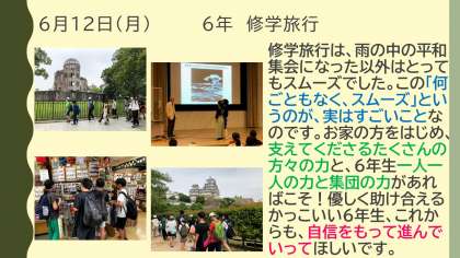 先週の修学旅行も、少し雨に降られましたが、とてもスムーズに、有意義に終えることができました。ご支援、ご協力、ありがとうございました。