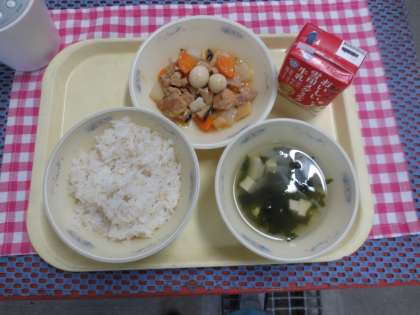 今日の給食は、麦ごはん、牛乳、プリプリ中華いため、とうふのスープです。