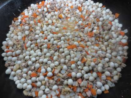「プリプリ中華いため」は、にんにくとしょうがを炒めて香りをつけた油に、しょう油と料理酒とごま油に漬け込んだ鶏肉を炒め、人参、たけのこ、しいたけ、こんにゃくを炒めて、さとう、しょう油、トウバンジャンで味付けし、うずら卵を入れ、最後に米酢と片栗粉でとじて仕上がました。