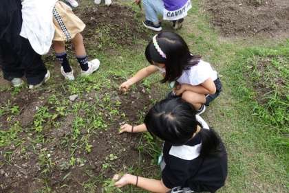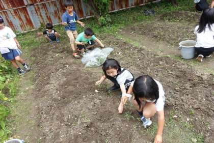 生活科の学習で、さつまいもの苗を植えます。よく育つように、畑の草むしりをしました。みんなで協力して、たくさんの草を抜くことができました。