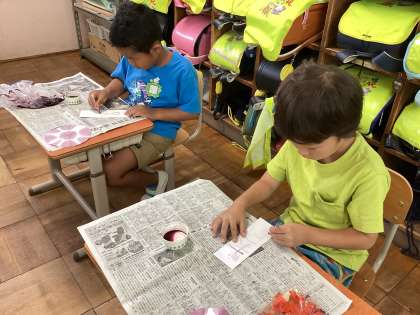 交流学級の友だちと一緒に、自分たちが育てた朝顔の花の色水で紙を染めたり、絵を描いたりしました。にじいろ学級の教室に戻って、作ってきた作品をみんなに見せていました。