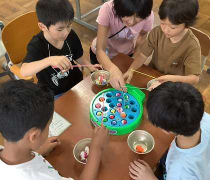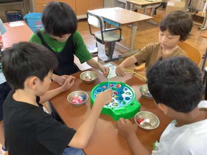 算数の学習で「おさかなつり」をしました。釣れた魚に書かれた数を、たし算したり、かけ算したりして、数の計算も一生懸命していました。また、赤い魚や黄色い魚など自分のお気に入りの色の魚も見つけたようです。