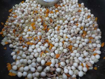 プリプリ中華いためというユニークな名前の由来は食材にあります。鶏もも肉、干しシイタケ、こんにゃく、うずら卵を使っていて、プリっとした食感が楽しめるので名付けられました。30年前に考案された献立です。