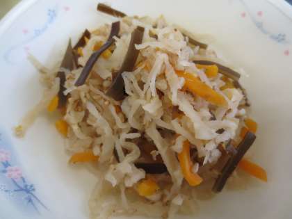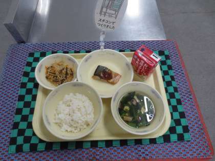 今日の給食は、胚芽米ごはん、牛乳、さばのつけ焼き、切干大根の三杯酢、すまし汁です。