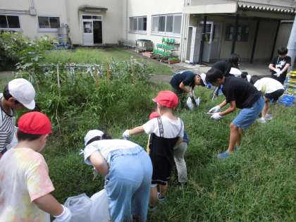 朝から学校行事で草引きをしました。