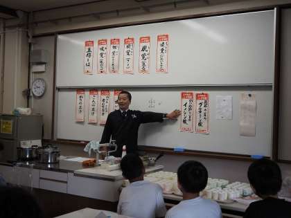 総合的な学習の時間で和食について勉強しています。給食の献立は和食が多いことに気付き、インターネットで和食について調べてみたけど、なかなか情報が得られず・・・・。子どもたちから「誰かに聞きたい!!」という声が。ということでゲストティーチャー、和食のプロに来てもらいました。主にだしのことについて教えていただきました。実際に飲んでみたり、嗅いでみたり五感を使って学ぶ授業でした。