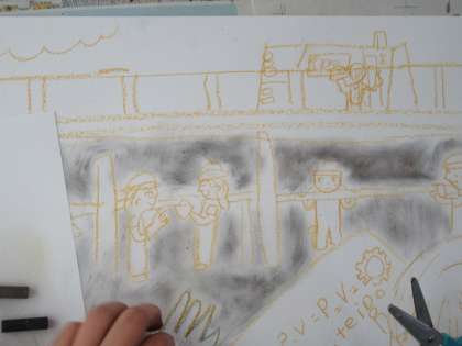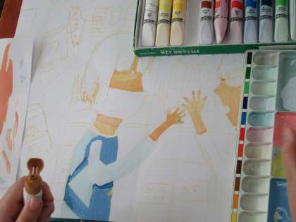 お話の絵の下書きができたら、絵の具で色を付けています。筆で塗るだけでなく、スポンジやローラを使ったり、コンテを使ったりして想像する場面を表現する姿も見られます。どんな作品が完成するのか楽しみです。