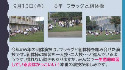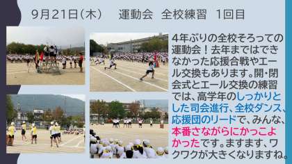 子どもたちは、運動会に向けて競技や演技、応援団などの係活動に頑張っています。各学年の練習も順調に進んでいて、本番が楽しみです。応援合戦やエール交換は4年ぶりの実施なので、応援練習も新鮮な感じです。