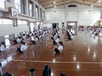 今日は、体育館と運動場それぞれで団体演技の練習をしました。