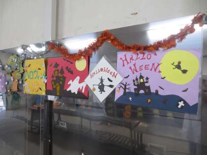 10月に入り給食室のホールは、ハロウィンが飾り付けられました。
