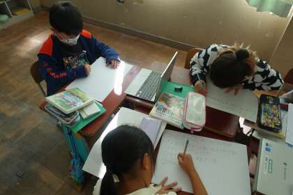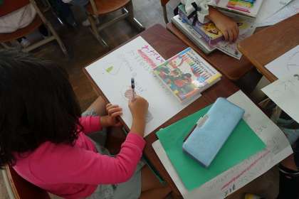 お店の方にインタビューをして分かったことを、他のグループの友達やお家の人に伝えるために、準備をしています。クイズを作ったり、ベスト3を考えたり、一人一人工夫して考えていました。