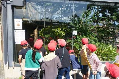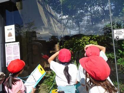 「シロテテナガザルどこ?」「上の方にいるけど、横になってて見えへん」「動いてくれんかな?」「どうぶつ園のじゅういで書いてあったやん。痛い所やし、隠してるんちゃう?」「みんなで見てるからかもしれんな、後からもう一回来よ!」