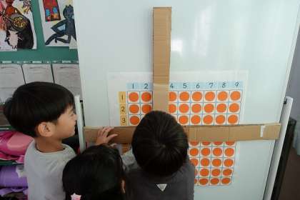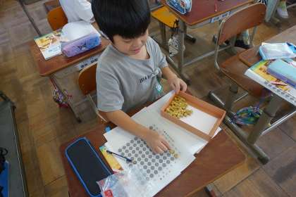 かけ算の九九の学習をしています。九九の唱え方を覚える時間になると、自分で覚える方法を選んで取り組んでいます。図で表しながら友だちに説明したり、ブロックをならべながら唱えたり、九九カードを見ながら唱えたり、自分が覚えやすい方法で集中して覚えようと頑張っていました。