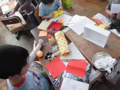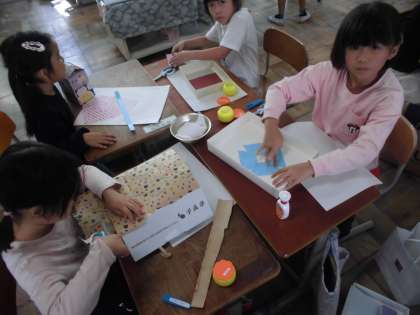 飾りになる紙などを、うまくはさみで切って貼付けしていました。
