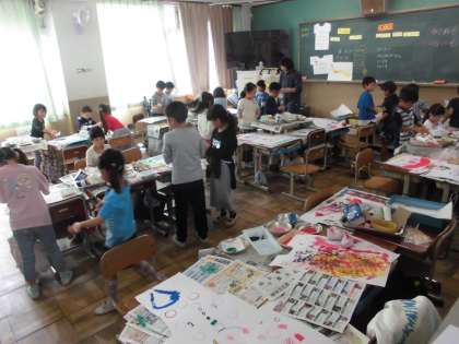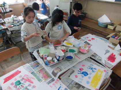図工の学習で、ペタペタ・コロコロとえのぐをぬりました。