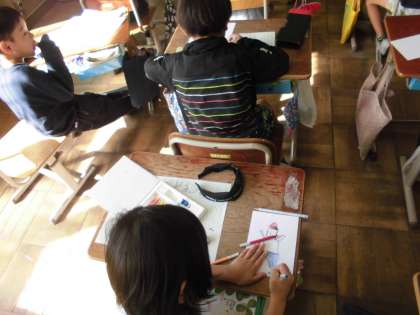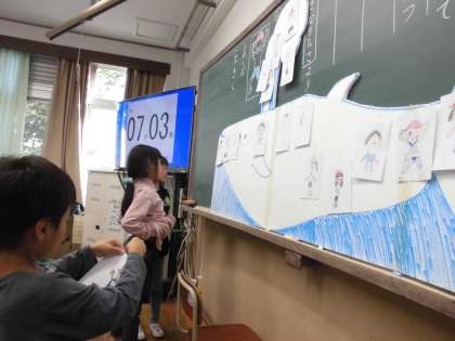 国語のくじらぐもの学習で、おおきなくじらぐもの絵に自分を書いてのせてみました。