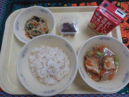 今日の給食は、麦ごはん、牛乳、厚あげの野菜あんかけ、切干大根のごま煮、しば漬です。